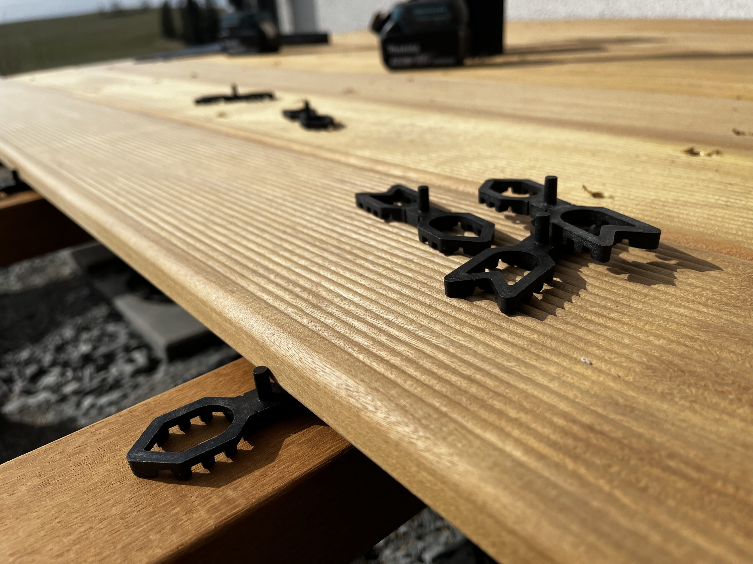 Následovalo rozmístění 132 rektifikačních terčů pro hlavní plochu terasy a jejich vyrovnání za využití laseru. Na terče jsme poté upevnili podkladové hranoly z tatajuby. Po přípravě konstrukce pro schody na stranách terasy mohla začít dlouhá pokládka drážkovaných terasových prken z garapy. Před dokončením hlavní pochozí části terasy bylo ještě nutné připravit konstrukci pro schod vpředu. Nakonec už zbývalo položit poslední dvě řady prken hlavní části a všechny schody rovněž opláštit prkny.