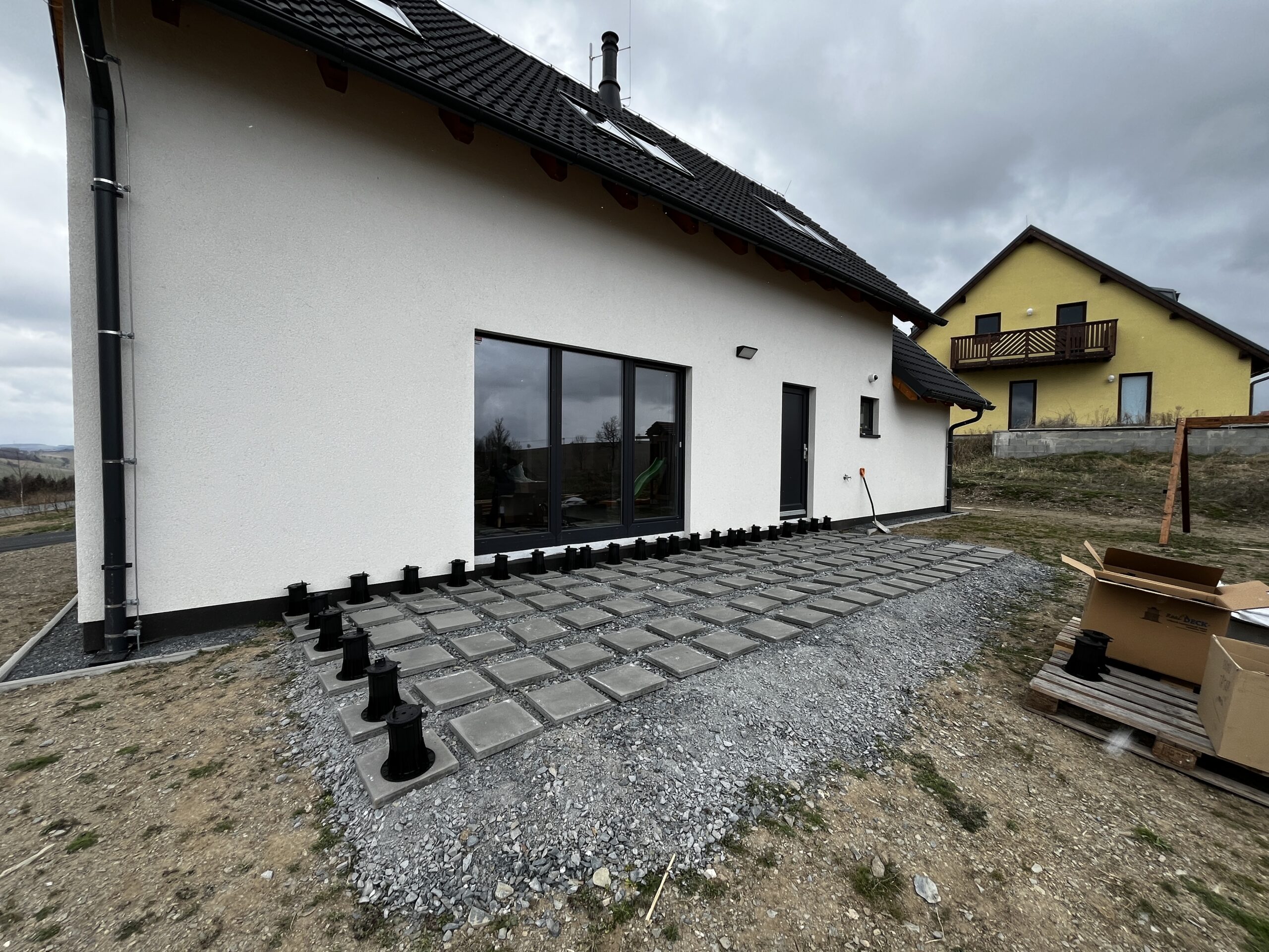 Po přejezdu celé republiky do Jeseníků a složení dřeva a betonových dlaždic z kamionů jsme začali s rozložením dlaždic na již připravený kamenitý podklad. Protože kamenitý podklad nebyl správně srovnaný, bylo třeba vzít do rukou lopatu a napravit to.