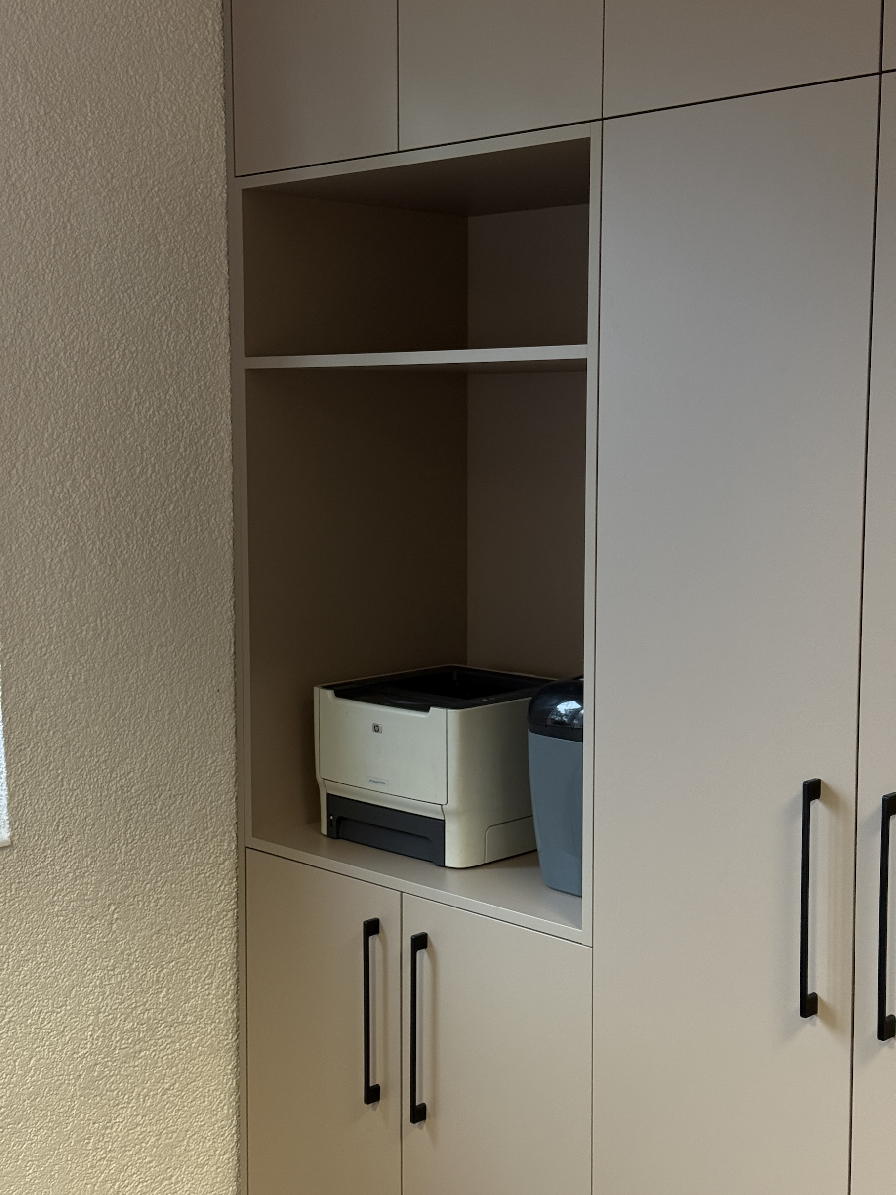Pro společnost 4dent jsme realizovali skříně na míru do kanceláří v Plzni. V rámci sestavy jsme realizovali část šuplíků a část polic, v rohu je pak korpus s přístupem přes vedlejší skříň pro uložení starých dokumentů. V otevřeném korpusu jsme pak připojili tiskárnu a přidali prodlužku pro případná další zařízení. S